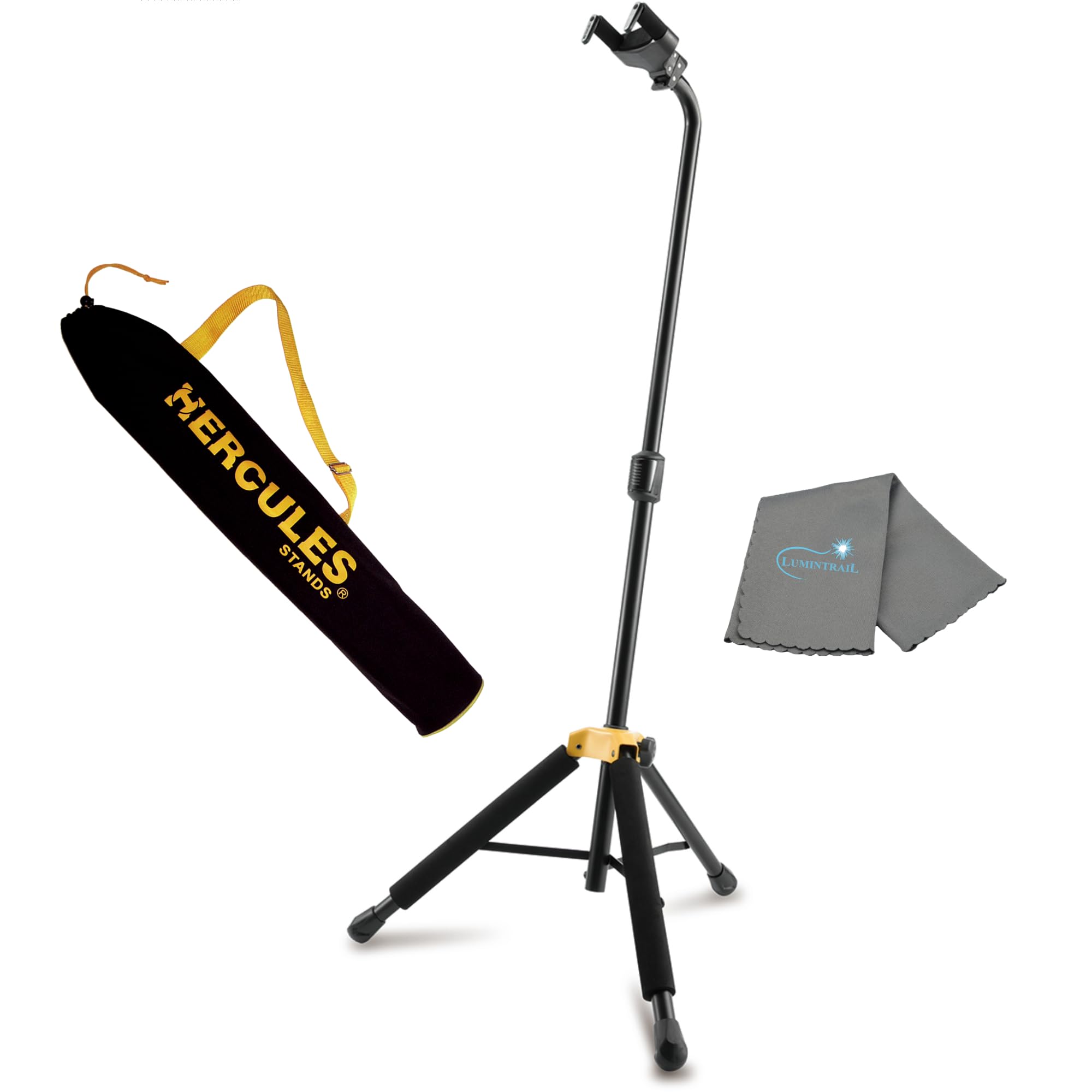 El Hercules GS414B PLUS es un soporte de alto nivel diseñado para combinar seguridad, adaptación y facilidad de uso. Su sistema AGS (Auto Grip System) bloquea automáticamente el mástil cuando se coloca el instrumento, ofreciendo una fijación firme y confiable. Incluye adaptadores N.I.N.A. para permitir el uso con instrumentos de mástil más estrecho (como banjos, mandolinas o ukeleles).