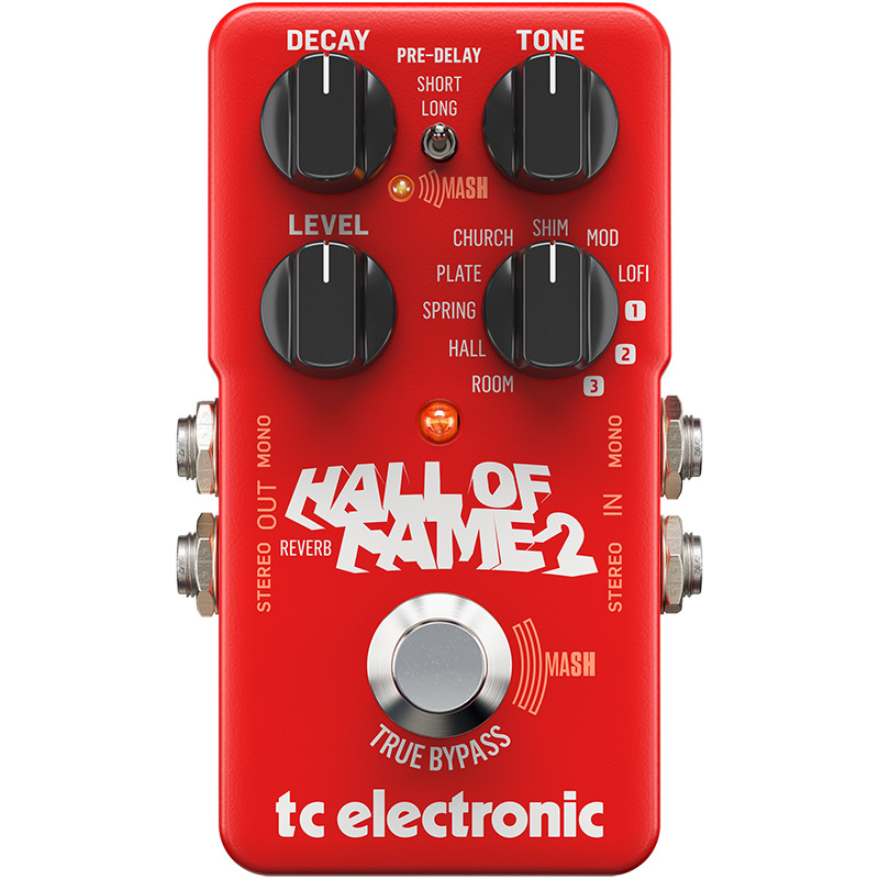 El Hall Of Fame 2 Reverb es un pedal de reverberación de segunda generación que eleva las posibilidades tonales mediante una interfaz compacta pero muy funcional. Al igual que el Flashback 2, incluye la tecnología MASH en el footswitch, lo que permite controlar dinámicamente parámetros del efecto según cuánta presión se aplique al interruptor, sin necesidad de un pedal de expresión externo.